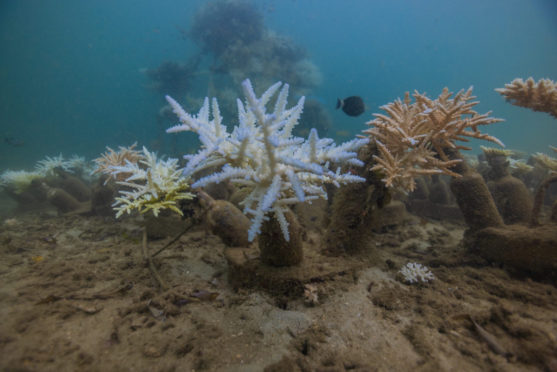 Trying to plant corals in a stressed reef could do more harm than good. After a pause in direct restoration activities, our team is outplanting again. We are currently increasing our nursery capacity, repopulating old nursery structures with new, heat-resilient corals. We also started re-planting surviving and heat-resilient corals onto our artificial reefs in August. So far, we’ve successfully replanted and outplanted over 3,000 corals.